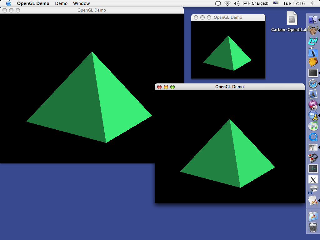 I've released a toy example of a running application that shows my Carbon code in action. It's based on an older version of the Carbon code. The application was compiled under OS X 10.3.8. It runs on 10.3.9 and also Tiger 10.4.0. I have not heard if it also runs under 10.4.1. Also demonstrated is some OpenGL code. The application and code are in an OS X DMG file so you need OS X to unpack the archive and run the application: